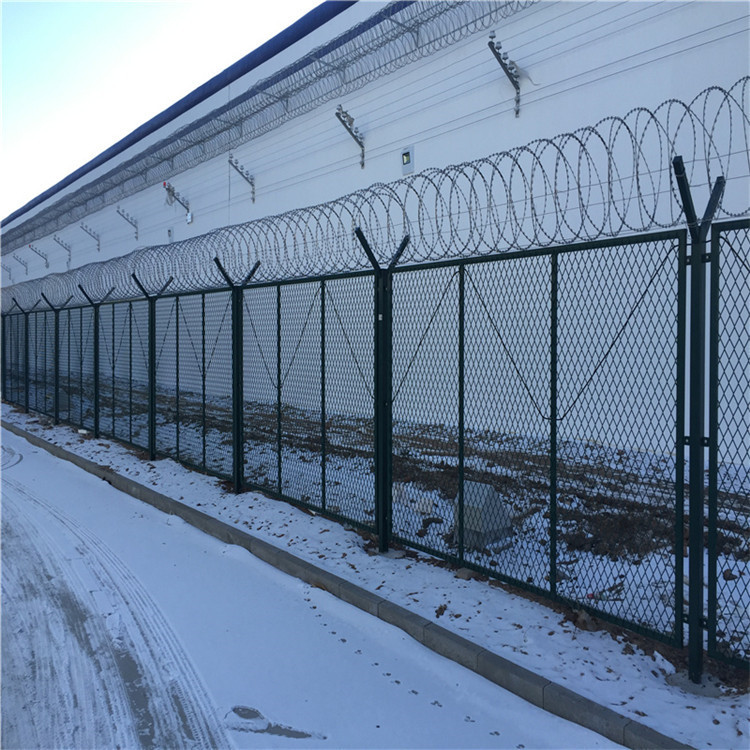 監(jiān)獄鋼網(wǎng)墻是一種新型防護(hù)網(wǎng),這種新型刀刺護(hù)欄網(wǎng)由蛇腹式刀刺網(wǎng)和焊接刀片刺網(wǎng)網(wǎng)片或有鋼絲焊接的網(wǎng)片組成。監(jiān)獄隔離網(wǎng)可平地安裝,也可在圍墻上二次安裝,有效防止攀逃。直刺式刺網(wǎng)隔離帶,是用柱體和普通刺繩橫、縱、斜向交叉綁定成刺網(wǎng)隔離帶。主要用于特殊地帶、軍事基地圈護(hù)、溝壕圈護(hù),安裝簡(jiǎn)易,經(jīng)濟(jì)耐用。 監(jiān)獄護(hù)欄網(wǎng)又稱(chēng)作“Y型安全防御護(hù)網(wǎng)”,是由V型支架立柱,加強(qiáng)型焊接片網(wǎng),安全防盜連接件和熱鍍鋅刀片刺籠組成,強(qiáng)度和安全防御性級(jí)別很高。近年來(lái),被廣泛應(yīng)用在監(jiān)獄,軍事基地等高安全場(chǎng)所。注:如果在監(jiān)獄護(hù)欄網(wǎng)頂部加裝刀片刺絲、刀片刺繩后又很好的增強(qiáng)了安全防護(hù)性能。采用電鍍、熱鍍、噴塑、浸塑等防腐形式,具有很好的抗老化、抗曬、耐候等特點(diǎn)。其產(chǎn)品造型美觀、花色多樣,既起到圍欄作用,又起到美化作用。由于具有安全性高、防攀爬能力好,網(wǎng)片連接方式采用特制SBS緊扣件,有效防止人為的破壞性拆卸,橫向四道折彎加強(qiáng)筋,使網(wǎng)面強(qiáng)度顯著增加。